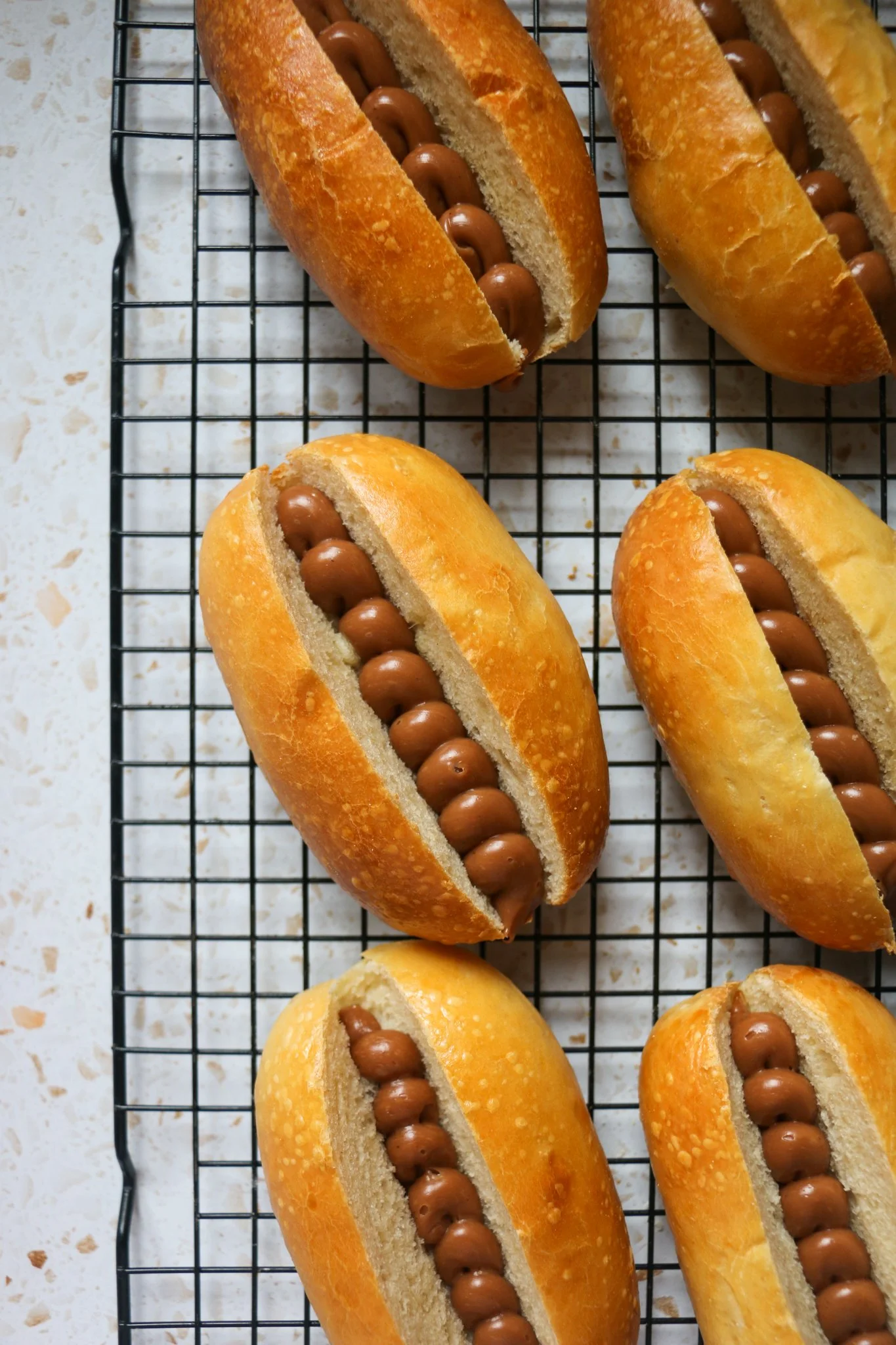 Line two baking trays with baking paper and set aside. Take the milk bun dough from the fridge and knock it back on a lightly floured worktop. Portion the dough into 8 pieces, each should weigh approx. 85g. Roll each piece into a ball, cover and rest for 10 minutes. Once rested, using the palm of your hand, roll the balls into logs by rolling them back and forth on the counter. They should be approx. 12cm. Very lightly dust the baking paper with flour and arrange your buns on the trays, leaving plenty of room for them to prove. Cover and leave to rise for 30 minutes-1 hour, until doubled in size. Meanwhile pre-heat your oven to 175°C.