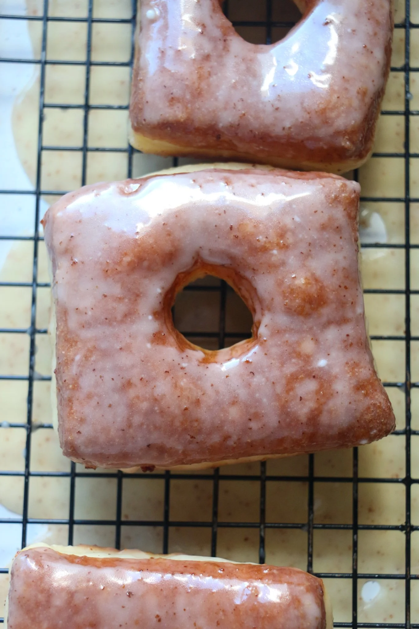 Once all of the doughnuts are fried, you can finish the brown butter glaze. Place all of the ingredients, apart from the boiling water, into a bowl and whisk together. Make sure to scrape the bottom of the brown butter pan to get all of those caramelised milk solids! Whisk in the boiling water. Use the glaze immediately, dipping each doughnut into it on both sides and setting back onto the rack to let any excess glaze drip off. I like to dip my doughnuts twice to make sure I get a good amount of glaze on them.
