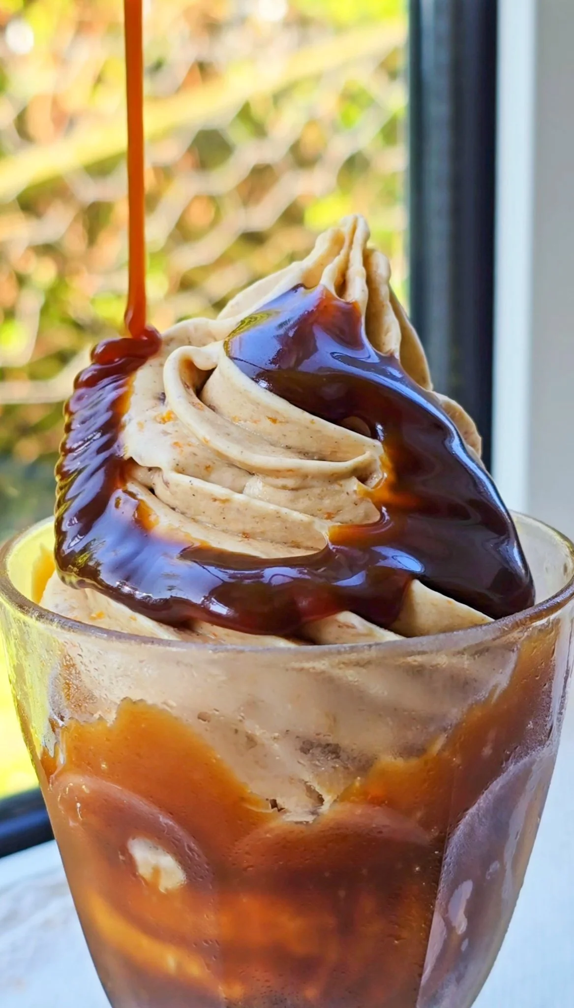 Drizzle the toffee sauce into the chilled sundae glasses. Chop some of the candied pecans and sprinkle them in. Pipe in your carrot cake softserve and top with more warm sauce and whole candied pecans. If you have any biscuits around, these crumbled on top is also delicious. Enjoy!