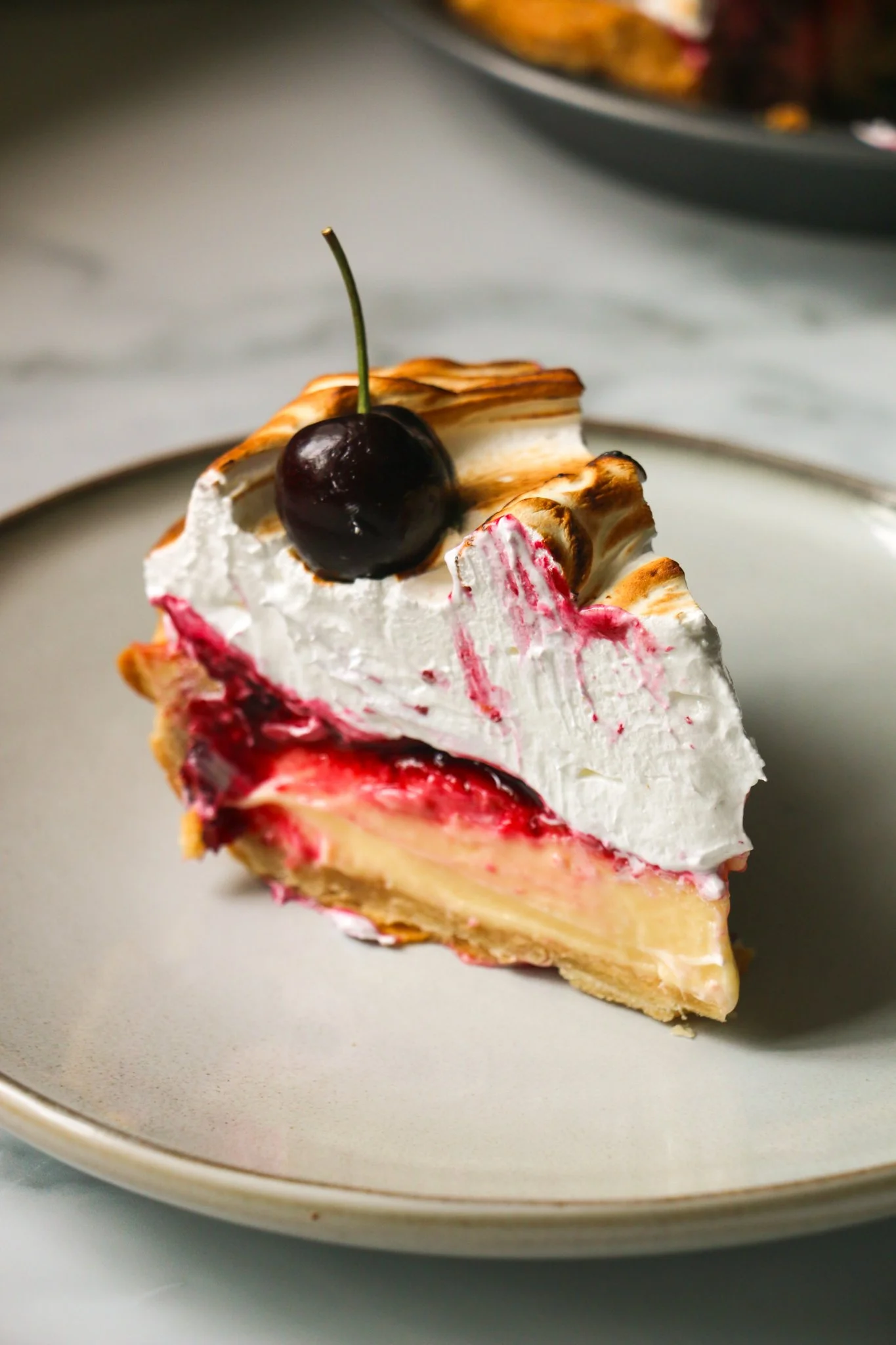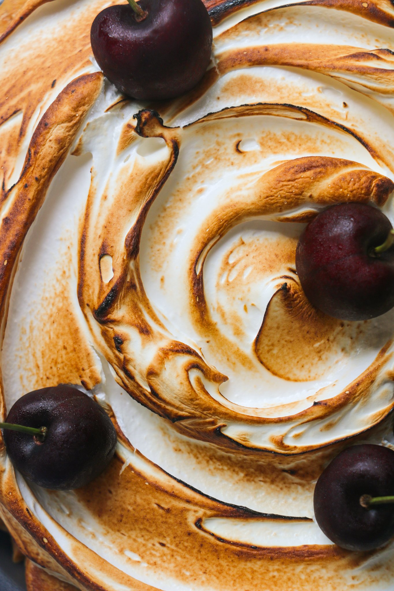I love the way the bright purple cherry compote seeps into the meringue with each slice. Torched meringue is my favourite so I sometimes torch the exposed meringue after I’ve cut a slice too.