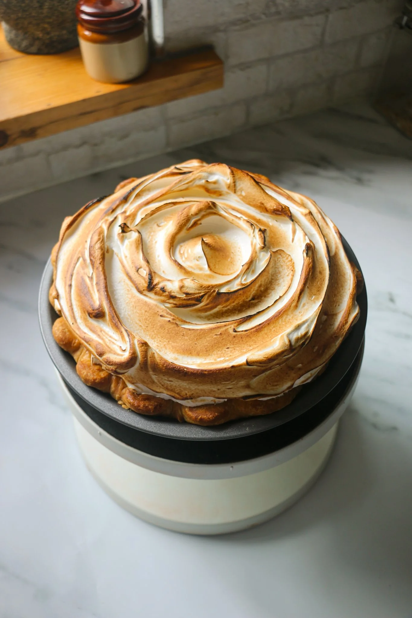 Preheat the oven to 110°C. Place your pie onto a baking tray. Pour the lemon filling into your cooled pie crust until it reaches just under the crimped edge. If you have any left, it can be pouring into ramekins and baked alongside the pie. Gently run a blowtorch over the top of the lemon filling to pop any air bubbles. Carefully place the pie into the oven and bake for 45-50 minutes until set. It should have a very slight jiggle in the middle. Turn the oven off and leave the oven door ajar until completely cool. Lightly place clingfilm on top of the lemon filling and refrigerate overnight.