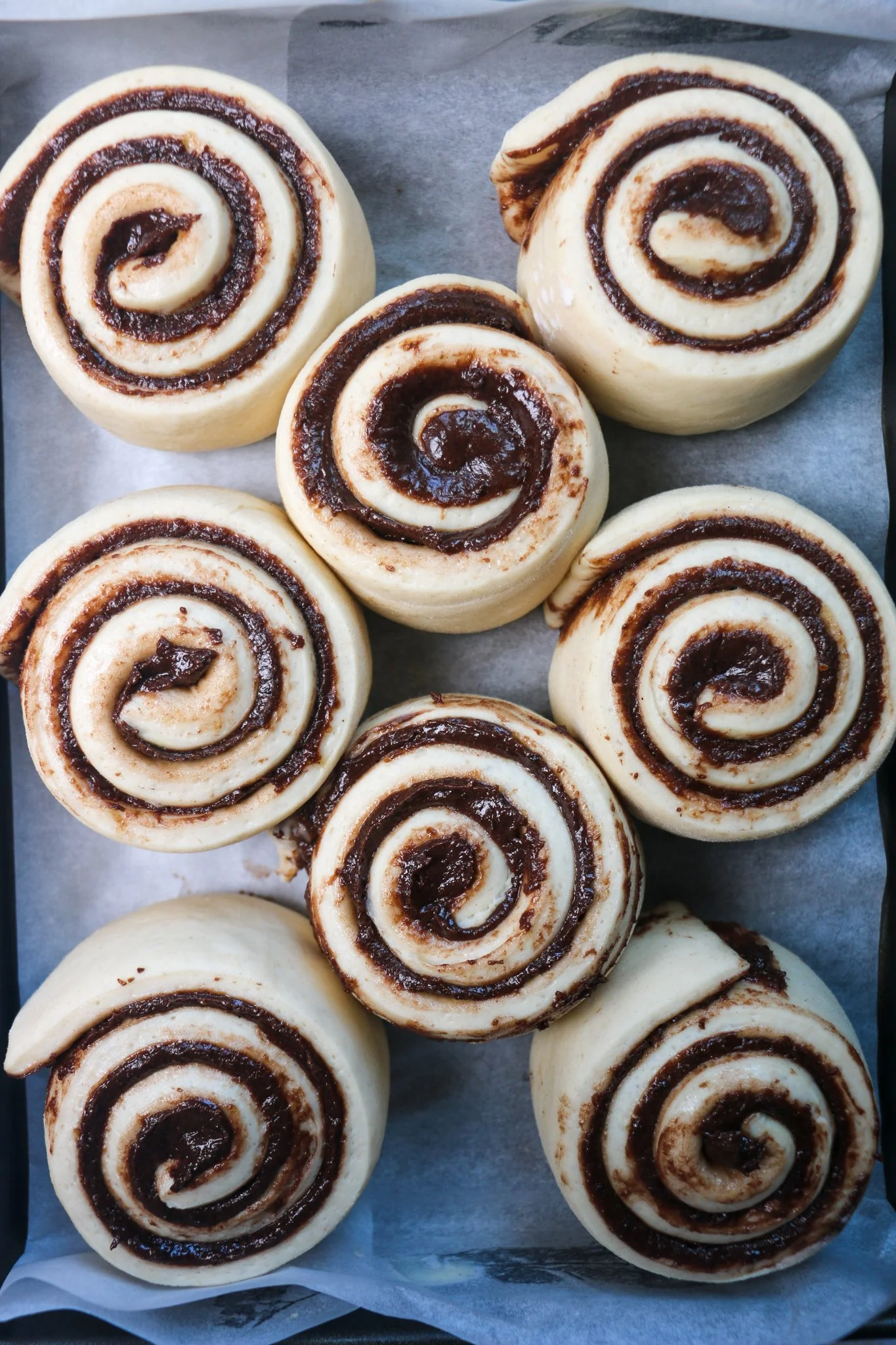 Tip the milk bun dough onto a floured surface and roll into a 40x30cm rectangle. Pop the filling in the microwave for a few seconds if its not completely spreadable. You’ll need it to be the texture of softened butter. Spread the chocolate hazelnut filling on top of the rolled dough in an even layer. Cut the rectangle into 5cm strips along the 40cm side so you have 8 strips. I find using a pizza cutter the easiest way to do this as the filling can be quite sticky. Roll each strip up into a swirl and place onto the lined baking tray. Cover and leave to rise for 1 hour at room temperature or until doubled in size.