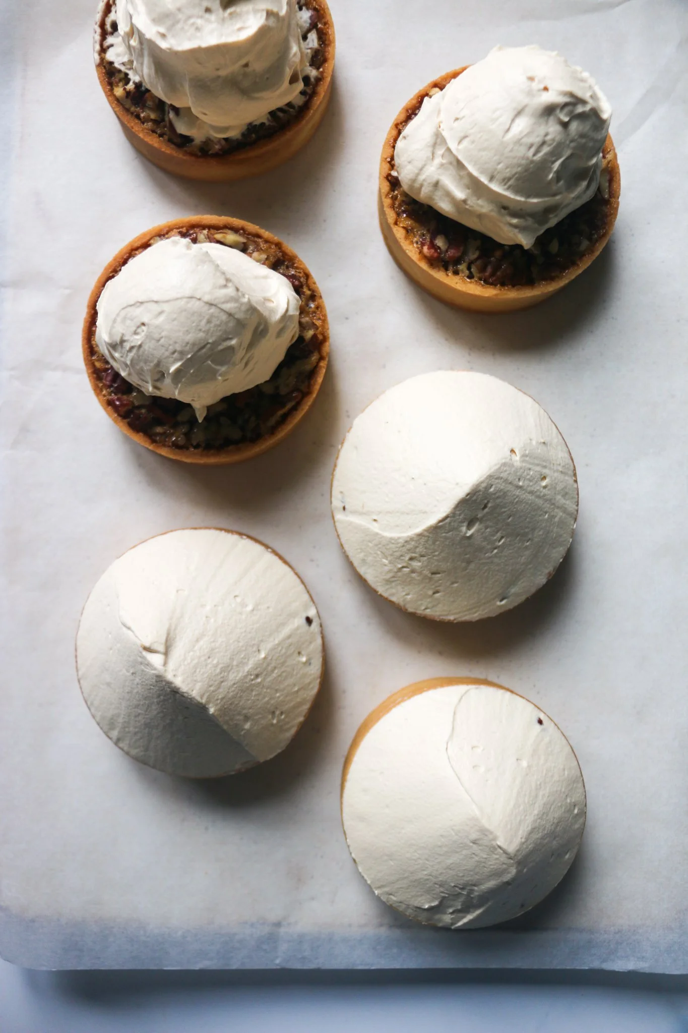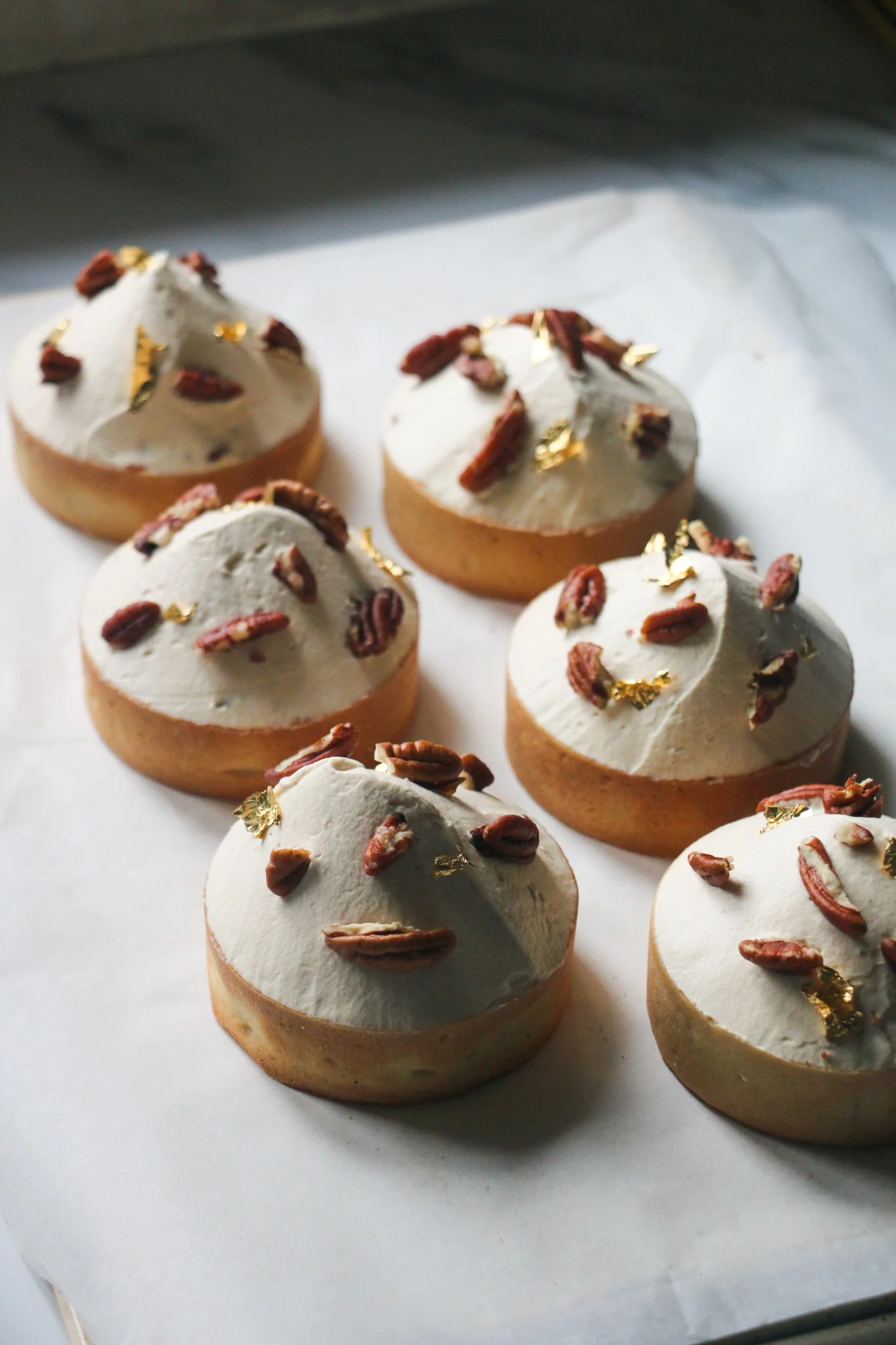 Once the tarts are completely cooled, you can finish them! Whisk the muscovado whipped ganache until it reaches medium soft peaks. It should be able to hold its shape but don’t take it too far or it will become grainy. Divide the cream between the six tarts by scooping it on top (I like to use a spring loaded ice cream scoop for this.) Using a small palette knife, shape the cream into a cone. Garnish with broken pieces of toasted pecan and gold leaf.