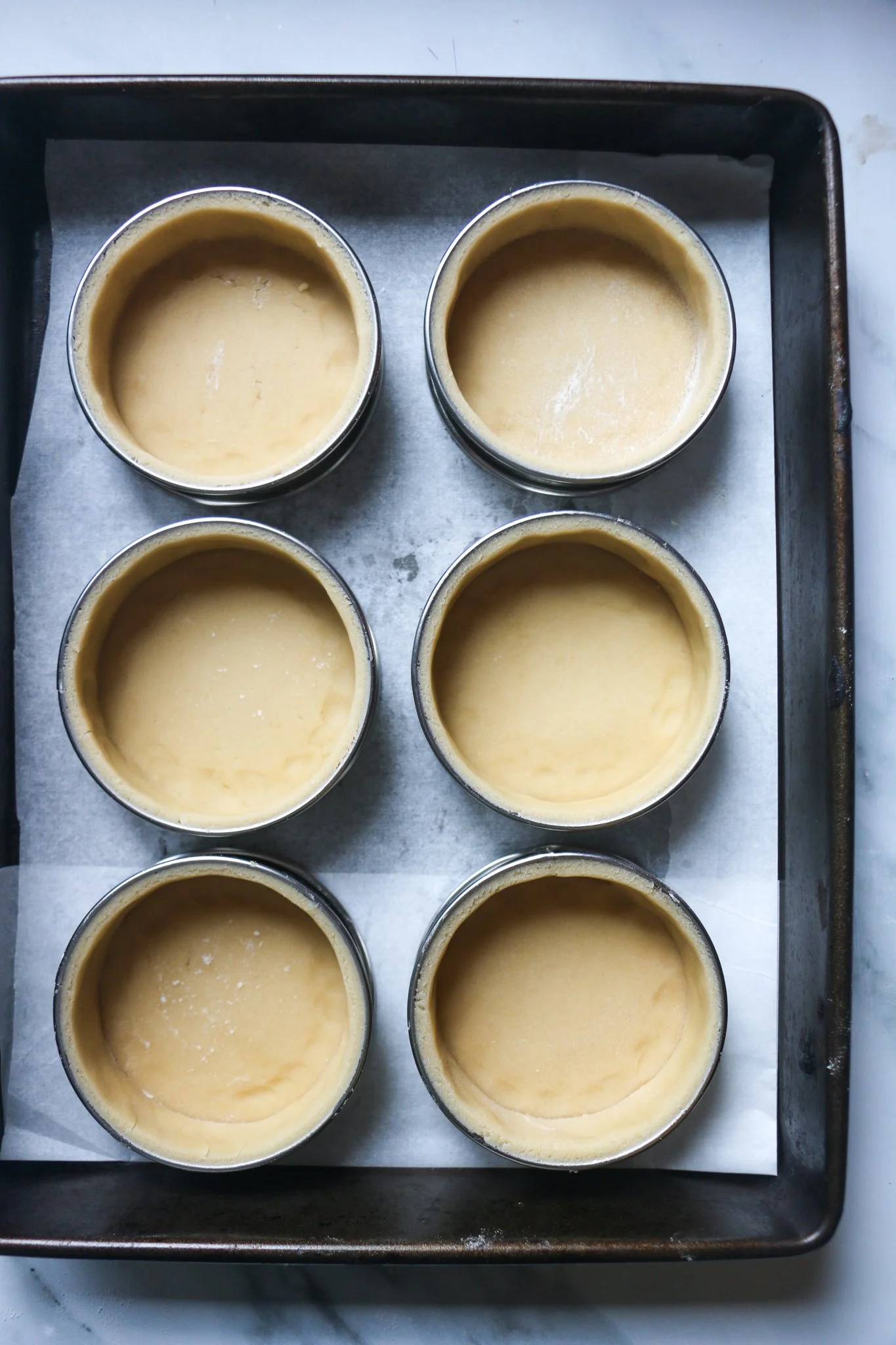Grease six 8cm tart rings and set them on a baking tray lined with baking paper. Take the pastry from the fridge and roll out onto a lightly floured worktop to approx. 2.5mm thick. Cut out six discs which are a few cm bigger than the rings, re-rolling the scrap pastry as needed. Line each tart ring by laying a pastry disc on top and gently easing it down into the inner sides of the prepared ring. Once the pastry is fully pushed into the corners, run a sharp knife around the top edge to remove any excess pastry. Place the lined tarts on your prepared baking tray. Place the tray into the freezer for 1 hour.