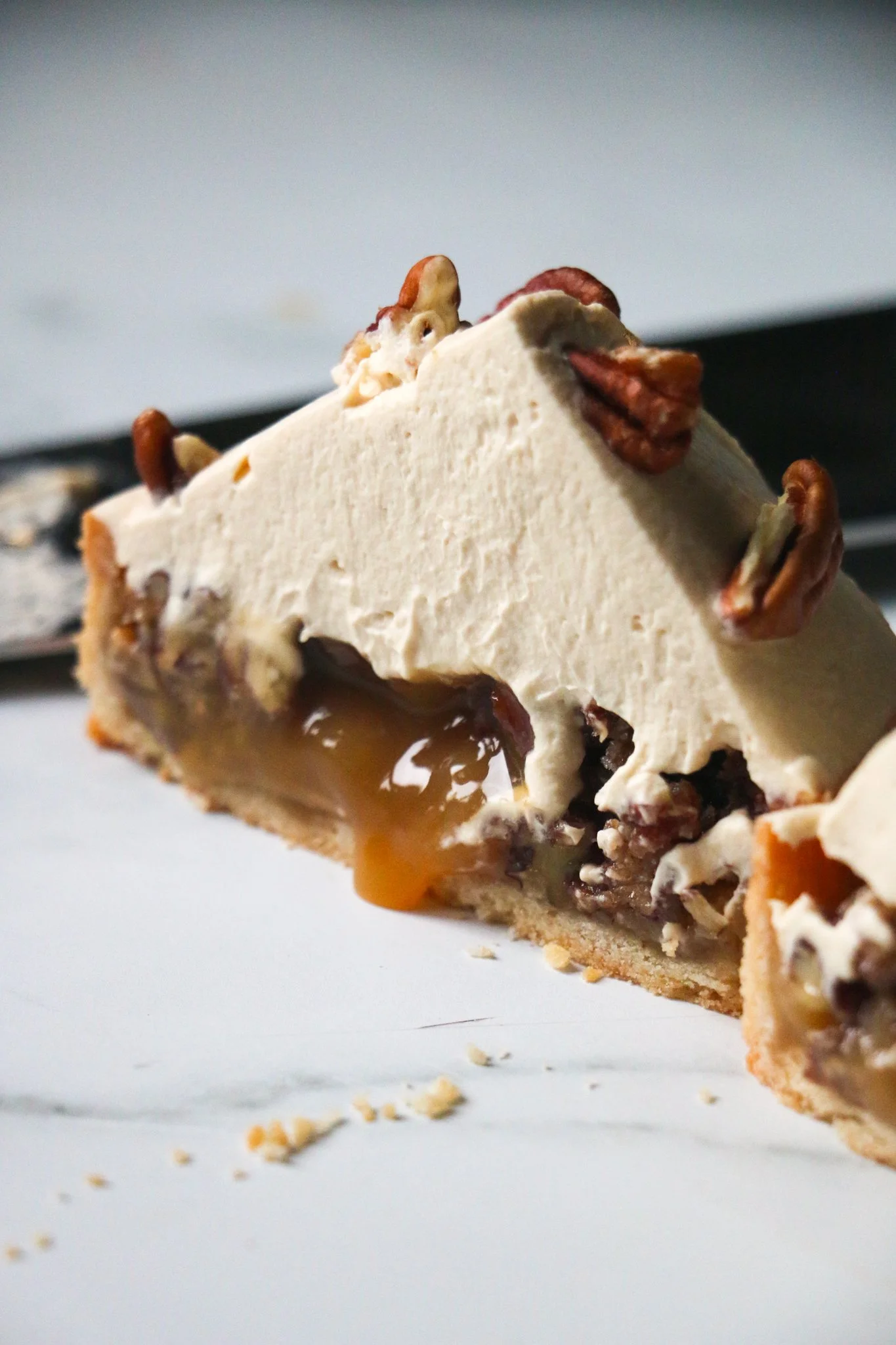 It’s officially comfort food season, and I don’t know what’s more comforting than a gooey pecan tart with a little mountain of soft muscovado whipped ganache on top.